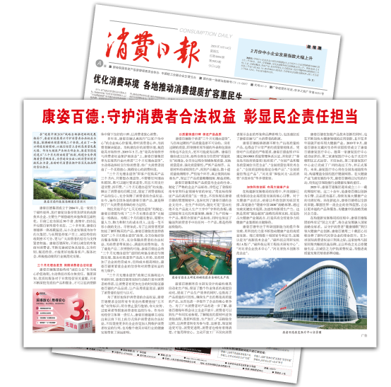《消費(fèi)日?qǐng)?bào)》于1985年創(chuàng)刊,由國務(wù)院國有資產(chǎn)監(jiān)督管理委員會(huì)舉辦,中國輕工業(yè)聯(lián)合會(huì)主管主辦。今年3月,消費(fèi)日?qǐng)?bào)以“守護(hù)消費(fèi)者合法權(quán)益 彰顯民企責(zé)任擔(dān)當(dāng)”為題,對(duì)康姿百德進(jìn)行了專版報(bào)道。