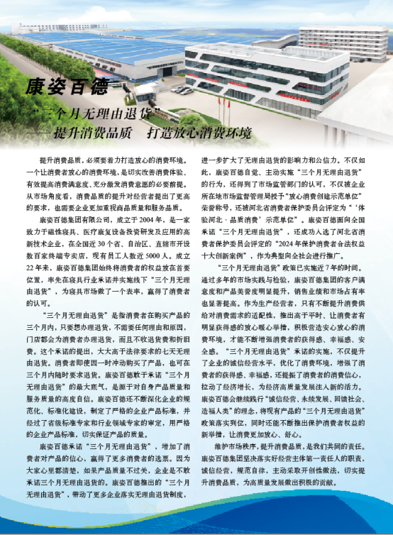 《中國消費者報》是國家市場監(jiān)督管理總局主管、中國消費者協(xié)會主辦的全國性報紙,在消費維權(quán)輿論監(jiān)督領(lǐng)域具有高度權(quán)威性、公信力和影響力。康姿百德以誠信經(jīng)營、積極維護消費者合法權(quán)益的良好社會形象,連續(xù)10年被《中國消費者報》專題報道。